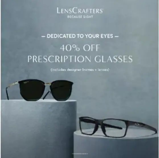 Receive 40% off when purchasing prescription glasses (select frames and lenses). Complete pair purchase required; savings applied to lenses. Valid on multiple pairs. Offer cannot be combined with vision insurance benefits, other offers, previous purchases, readers, or non-prescription sunglasses. Valid prescription required. Alain Mikli®, Brunello Cucinelli®, Chanel®, Diesel®, Maui Jim®, Miu Miu®, Moncler®, Oliver Peoples®, Persol®, Prada®, Prada Linea Rossa®, Cartier®, Dior®, Lindberg®, and wearable electronic frames excluded. Additional exclusions may apply, see store associate for details. Discounts are off tag price. No cash value. Valid in-store and online at LensCrafters.com. Void where prohibited. Offer expires 10/19/2025.
