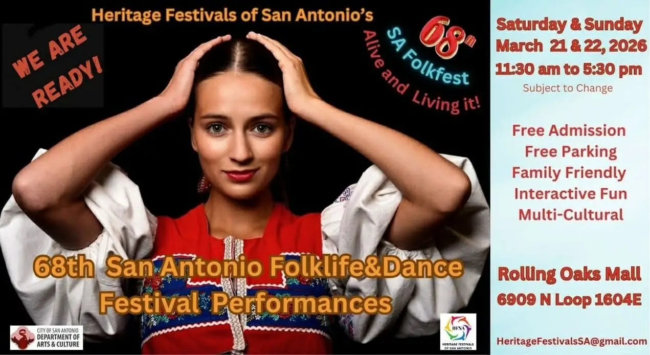 Celebrate culture, music, and dance at the 68th Annual San Antonio Folklife & Dance Festival! Enjoy a vibrant, family-friendly experience featuring interactive, multicultural performances that highlight traditions from around the world.