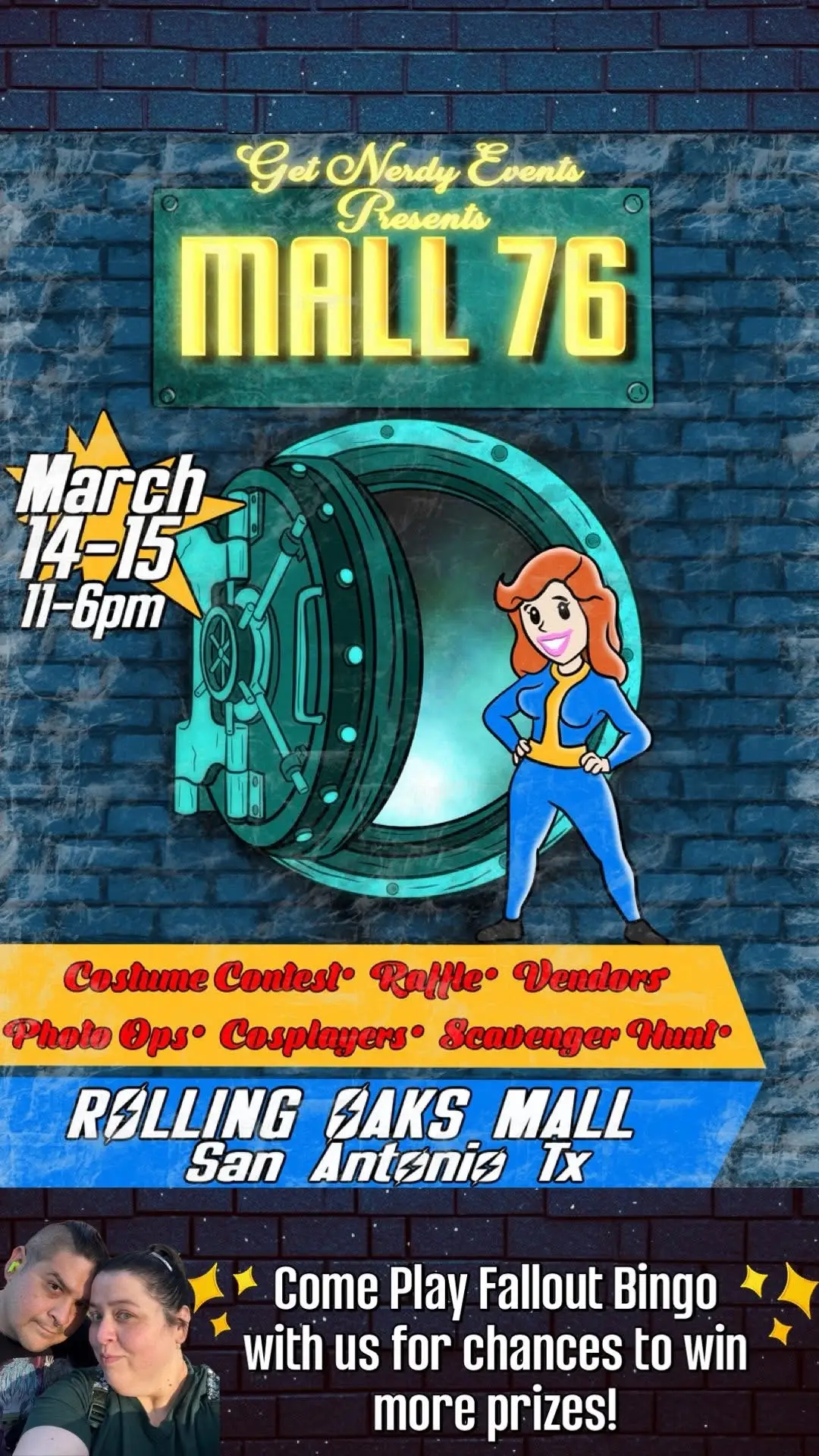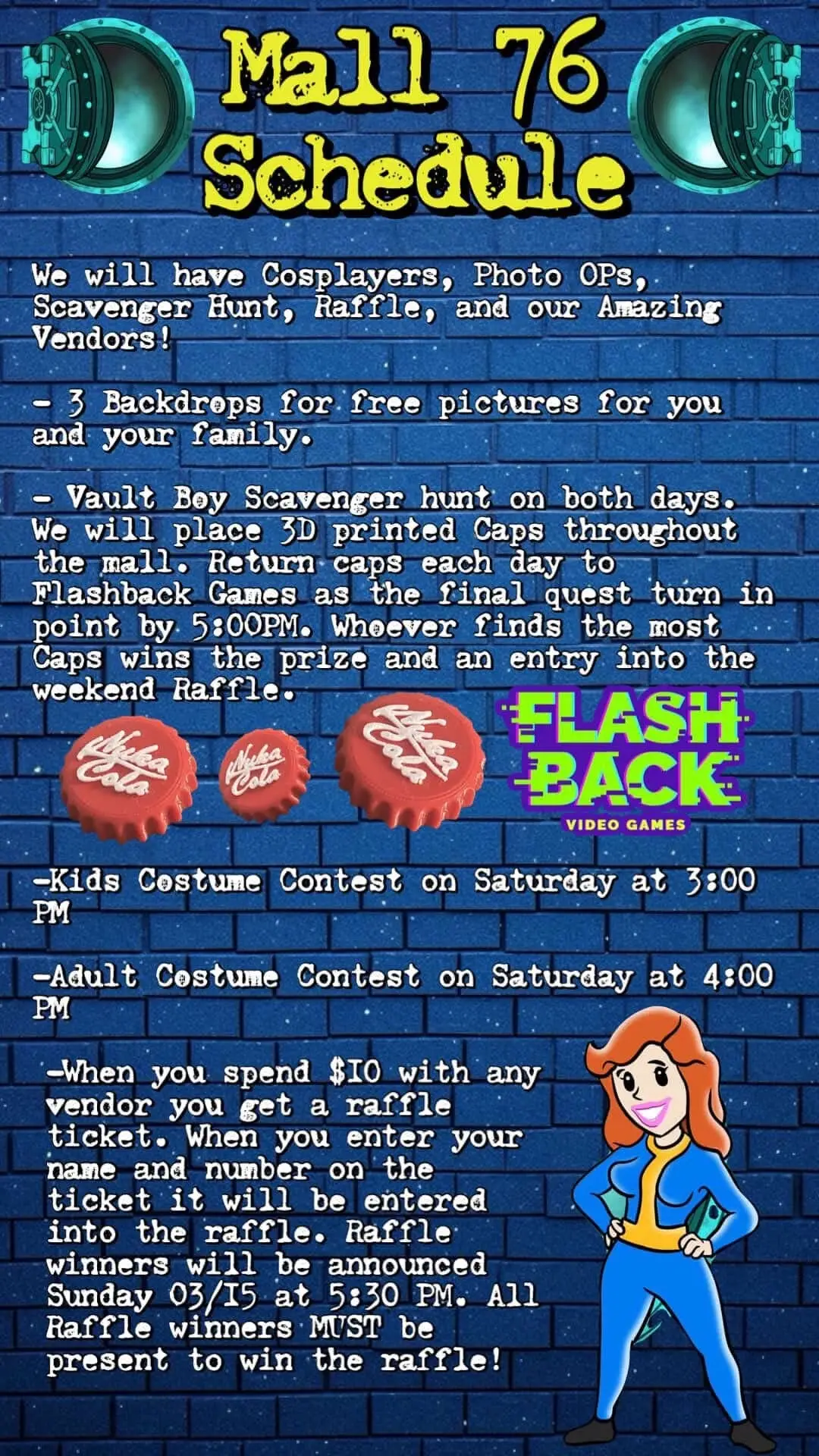 Inspired by Fallout, Mall 76 brings cosplay, themed photo ops, a Vault Boy scavenger hunt, raffles, and amazing vendors together for one epic weekend. Collect 3D printed Nuka Cola bottles throughout the mall and join the fun.